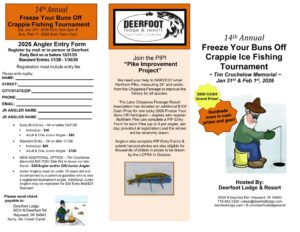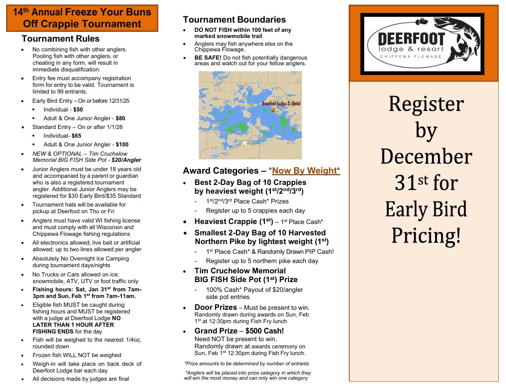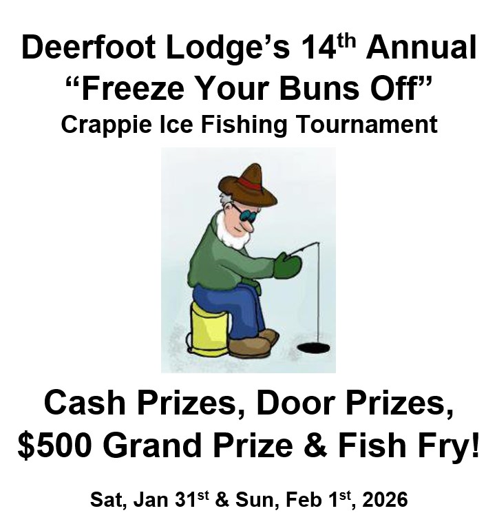 Join us for the 14th Annual “Freeze Your Buns Off” Crappie Ice Fishing Tournament on the Chippewa Flowage, Saturday, January 31st and Sunday, February 1st, 2026! Register by Wednesday, December 31st, 2025 to secure your spot at Early Bird Pricing before registration rates go up! $500 Cash Prize, Door Prizes, Cash Prizes in Crappie and Northern Pike categories, based on WEIGHT this year instead of length, and NEW this year, a Big Fish Side Pot award in honor of our late friend, Tim Cruchelow. Deerfoot’s bar & grill will be open for the Winter Season starting 12/26, Weds-Sun at 9:00am, we will also be open on New Year’s Eve. Mail a check, or stop into Deerfoot’s bar & grill to drop off cash or check for your entry.